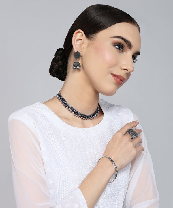 Complete your collection with our stunning oxidised jewelry set combo, a perfect blend of elegance and tradition. Each set features intricately designed pieces, including a necklace, earrings, bangles, and rings, crafted from high-quality materials with a rich oxidised finish. Designed for women who appreciate unique styles. This combo is ideal for weddings, festivals, or casual outings. The versatile designs pair effortlessly with ethnic and fusion wear, adding a bold statement to any outfit.