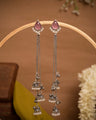 These beautifully handcrafted Kashmiri-style earrings showcase the timeless artistry of traditional design with intricate metal detailing and graceful layered elements. Featuring finely worked motifs, delicate stone accents, and pearl highlights, the earrings are enhanced with long cascading chains and classic ghungroo-style danglers that create fluid movement with every step.