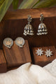 Elevate your ethnic charm with this exquisite Oxidised Silver Earring Trio Set, crafted to suit every mood and moment. This handcrafted collection features three distinct earring designs, each showcasing timeless artistry and elegance. The set includes long peacock danglers with intricate lattice work and silver ball drops, perfect for festive and traditional wear. The geometric triangle studs add a bold, modern flair ideal for Indo-western styling, while the sun-inspired petal half hoops bring a soft, radiant charm to your everyday outfits. Made from premium oxidised silver, each pair offers a rustic vintage finish that’s both durable and skin-friendly.