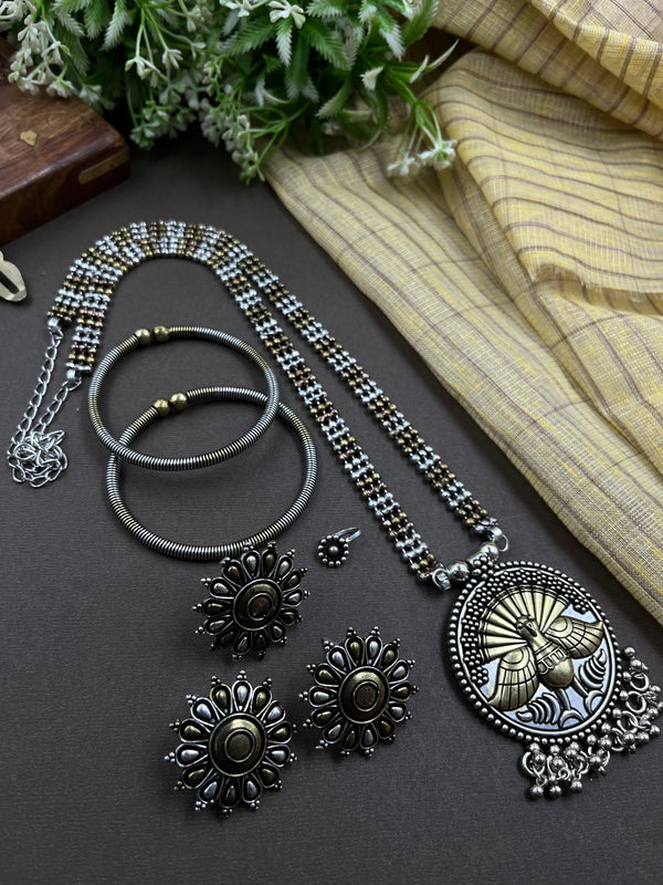 Complete your collection with our stunning oxidised jewelry set combo, a perfect blend of elegance and tradition. Each set features intricately designed pieces, including a necklace, earrings, bangles, and rings, crafted from high-quality materials with a rich oxidised finish. Designed for women who appreciate unique styles. This combo is ideal for weddings, festivals, or casual outings. The versatile designs pair effortlessly with ethnic and fusion wear, adding a bold statement to any outfit.